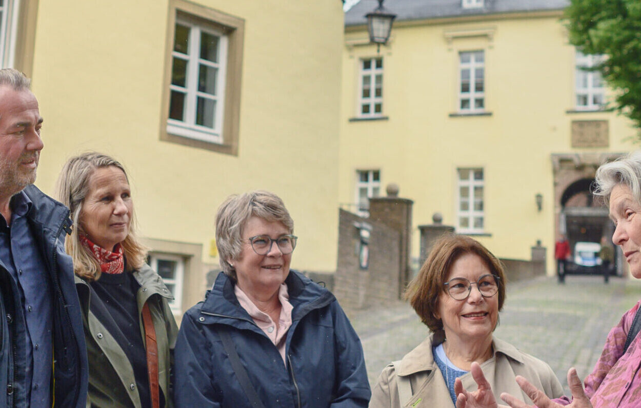 Gruppe von sechs Personen bei einer Führung an der Schwanenburg, eine Person erklärt etwas. Im Hintergrund ist der Turm der Schwanenburg sichtbar.