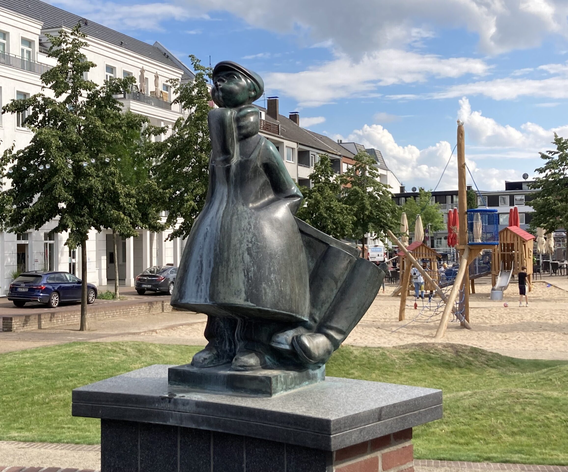 Die spuckende Bronzefigur sorgt bewusst für Überraschung und Schmunzeln. Das Schüsterken ist ein humorvolles Denkmal, das nicht nur an die Schuhmachertradition in Kleve erinnert, sondern auch als interaktive Kunst im öffentlichen Raum gestaltet wurde.