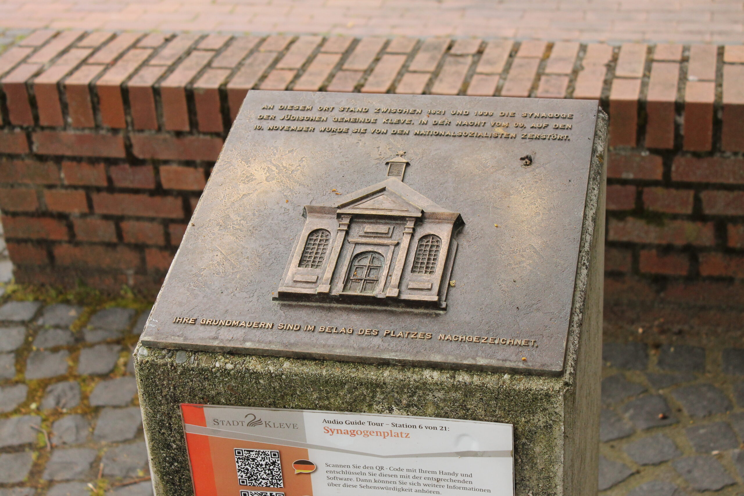Der Synagogenplatz erinnert an die ehemalige Synagoge in Kleve, die einst im Stil des niederländischen Klassizismus erbaut wurde. Ihr Inneres war reich ausgestattet und zeugte vom lebendigen jüdischen Gemeindeleben in der Stadt.