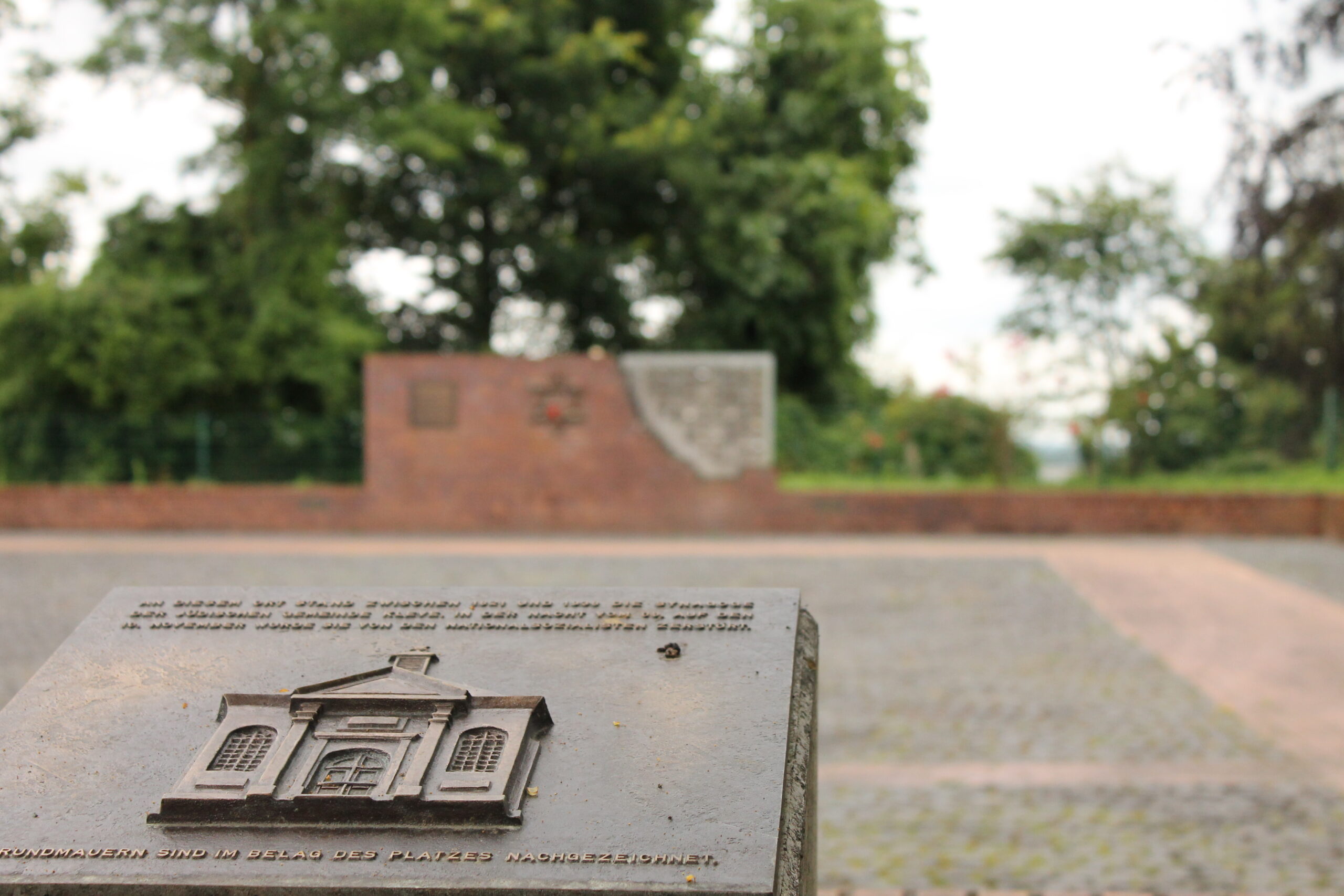 Die heutige Gedenkstätte zeigt mithilfe von Ziegelmarkierungen die Umrisse der früheren Vorhalle und des Gebetsraums der Synagoge.